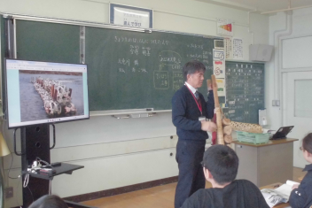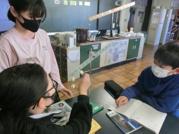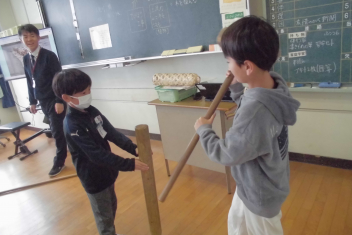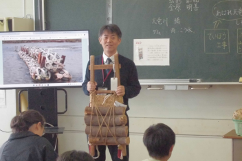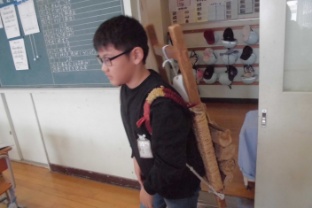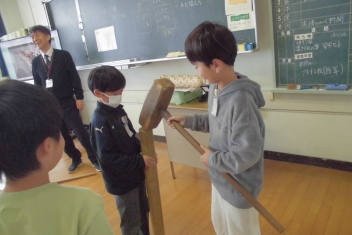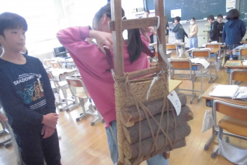 • 12月3日(水)4年生の社会科の授業で、移動博物館として借りてきた金原明善にちなんだものについて学習しました。しょいこを実際、背中につけて金原明善の苦労を感じていました。