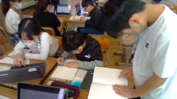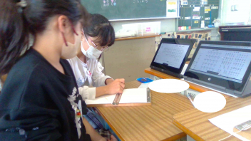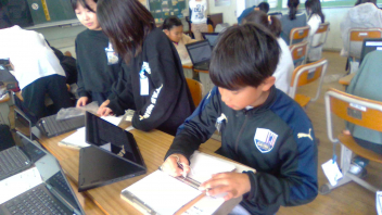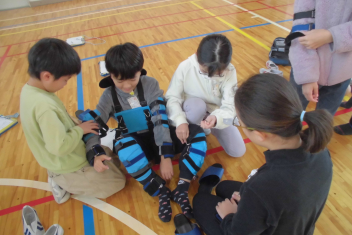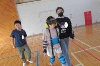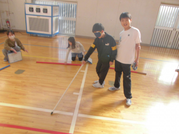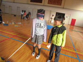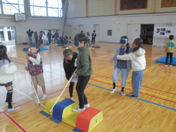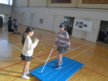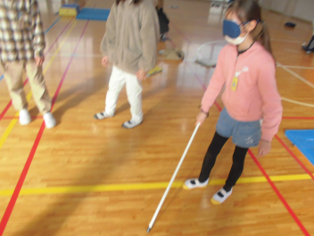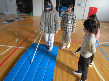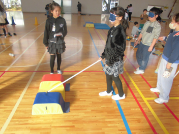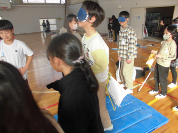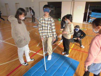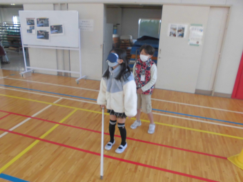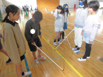 • 12月1日(月)総合的な学習の時間で、福祉について体験学習をしました。高齢者体験・アイマスク・白杖体験・点字体験をしました。グループごとに声を掛け合って、安全に注意しながら行いました。