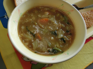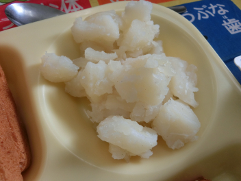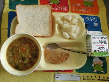 リヨネーズポテトは、フランスの「リヨン地方 」の料理 です。リヨン地方 は玉 ねぎの産地 で、玉 ねぎを使 った料理 の名前 に、「リヨン風 の」という意味 のリヨネーズをつけることがあります。今日 は、しっかりと炒 めた玉 ねぎに茹 でたじゃがいもを加 えて、塩・こしょうで味 つけをしました。また、ボロニアソーセージは、フランクフルトソーセージよりも太 いソーセージのことです。今日 は輪切 りに切 ってフライにしました。パンによく合 う組 み合 わせですね。味 わっていただきました。