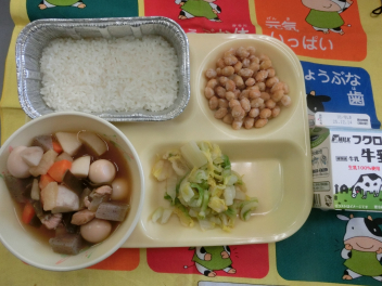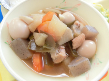 今日 の主菜 の「関東煮 」は寒 い季節 にぴったりの料理 です。給食 の「関東煮 」は、だし汁 にしょうゆと砂糖 とみりんを加 えて味付 けし、だいこん・こんにゃく・にんじん・さといも()(・鶏肉)・こんぶ・うずらの卵 などを加 えてじっくり煮込 んだものです。昔 、関西 では、みそ田楽 のことを「おでん」と呼 んでいたことから、区別 するために、だし汁 にしょうゆやみりんを加 えて煮込 んだ料理 を「関東煮 」と呼 んだそうです。静岡 おでんのように、黒 いつゆで煮込んだはんぺんやこんにゃくに、だし粉 をふりかけるものなど、全国 にはいろいろなおでんがありますね。
