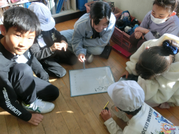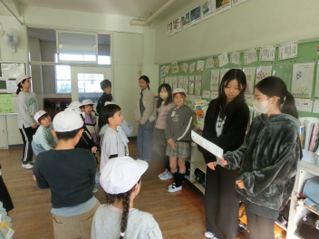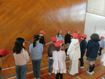 12月3日(水)昼休みに、たてわり遊びが行われました。「連想ゲーム」「コロコロドッカーン」「名前あてクイズ」「フラフープくぐり」「イラスト伝言ゲーム」「宝さがしゲーム」「しんげんち」「じゃんけんれっしゃ」「せなかの言葉あてゲーム」などが行われました。6年生が中心となって、ルールを説明して、楽しく遊んでいました。