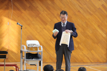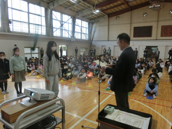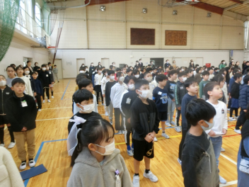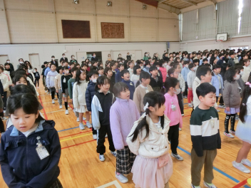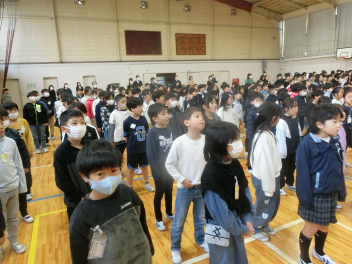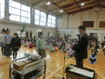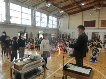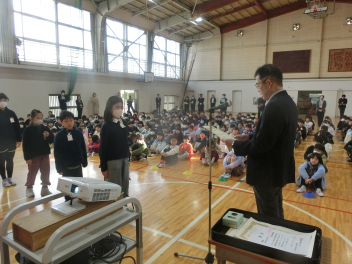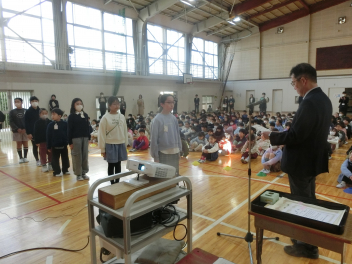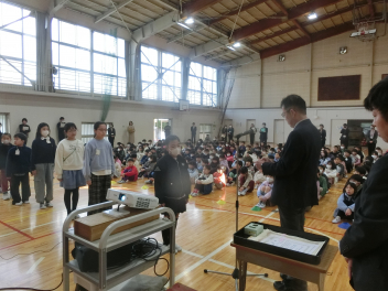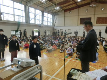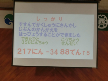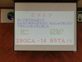 学校の合言葉「にこにこ」「しっかり」「のびのび」「こつこつ」について、2学期児童がどれだけ頑張ったかの振り返りと校長先生の振り返りの話がありました。インフルエンザ等で欠席している人が多かったので、人数は1学期より少なくなりましたが、2学期の児童の頑張りに対する評価は、すべてアップしていました。