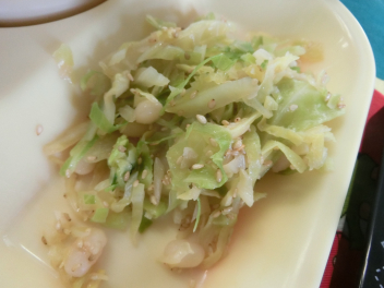 豆 には、おなかの中 をきれいにそうじしてくれる、「食物 せんい」が多 く含 まれていて、健康 によい食 べ物 として注目 されています。今日 のサラダに入っている豆 は「白 いんげん豆 」といいます。豆 は乾燥 させて保存 しますが、一晩水 につけると2~3倍 の大 きさになります。今日 は茹 でた白 いんげん豆 とキャベツを、給食室 で手作 りした「ごま入 りドレッシング」であえました。