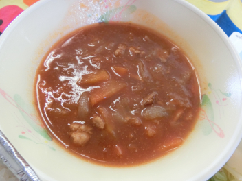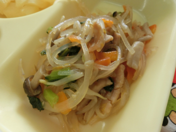 今日 は韓国料理 を紹介 します。ひとつ目 は「チゲ」です。チゲとは「鍋料理 」という意味 です。肉 や豆腐 のほかに白菜 キムチも入 っているためピリッとしたからさがあり、体 を温 めてくれます。ふたつ目 は「チャプチェ」です。チャプチェは、春雨 とせん切 りにした野菜 をごま油 で炒 めた料理 です。ふたつとも韓国 で人気 のある料理 です。味 わっていただきました。