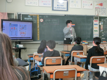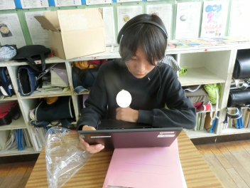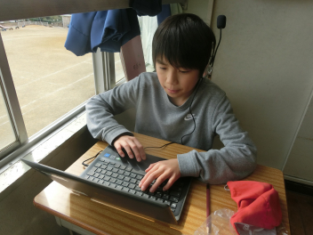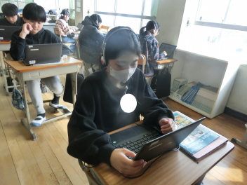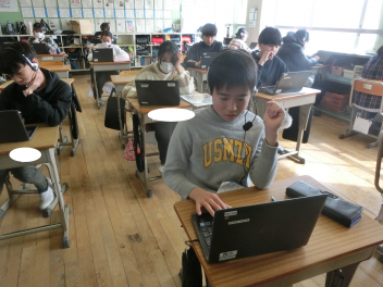 • 2月10日(火)6年生が、外国語科の授業で「Speaking クエスト」という学習をクロムブックでしていました。音声と画像が出てきて、それに英語で答えるという活動でした。みんなクロムブックを見ながら、ヘッドホンとマイクをつけて、聞いた内容に対して英語で答えていました。