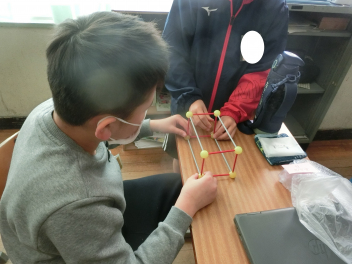 • 2月10日(火)4年生が、算数科「立体」の授業で、直方体と立方体の辺や面について調べていました。同じ長さの辺が何本あるかや同じ面の数などを 実物の立体や立体模型などを使って確かめていました。