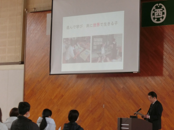 2月17日(火)今日の午後、来年度1年生になる児童と保護者が来校し、「入学設営会」を行いました。まず校長先生より、学校の「教育方針」の説明が行われ、次に現1年生の学年主任より、「小学校生活の概要と入学までの心構え」についての話がありました。また、養護教諭より「健康管理」についての話もありました。説明会終了後、学用品販売や体育衣料販売が行われました。子供たちは、現1年生と現5年生といっしょに触れ合ったり、遊んだりしました。4月9日(木)が入学式の予定です。入学してくることを楽しみにしています。