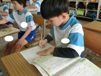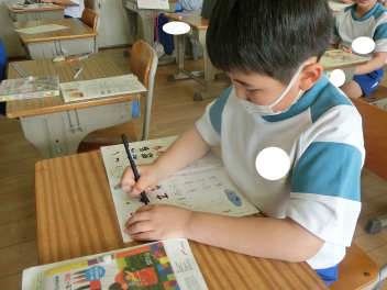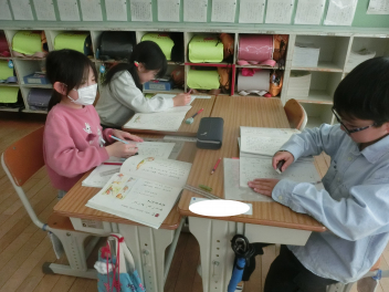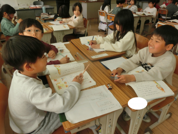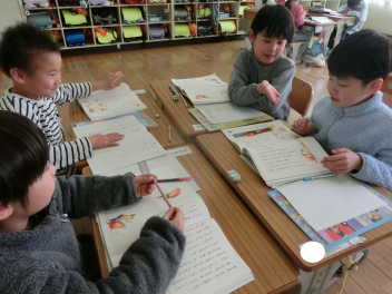 • 2月24日(火)1年生が、国語科「ずうっと ずっと 大すき」の授業で、心に残ったことすきなところをノートに書いていました。まず、一人一人が、ノートに書いたあと、グループで伝え合っていました。