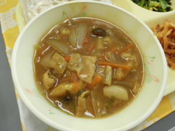 今日 はカレーうどんです。豚肉 や、にんじん、たまねぎ、根深 ねぎ、油揚 げ、ぶなしめじなどたくさんの具 が入 っています。みなさんは、給食 のカレーライスとカレーうどんの違 いが分 かりますか?カレーうどんには、みそ汁 にも使 われている「さば節 」でとった出汁 が使 われています。出汁 が加 わることにより、カレーの辛 さに出汁 のうまみが合 わさり、うどんに合 う味付 けになっています。