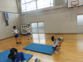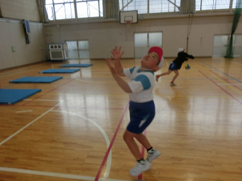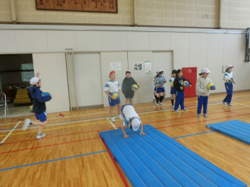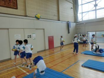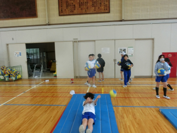 • 2月25日(水)3年生が、体育科「多様な動き」の授業で、ボールをつかった動きをしていました。「ボールを床にバウンドさせて、自分がその場で一回転して、ボールキャッチ」「ボールを空中にあげて、マットの上で前転をして、落ちてきたボールをキャッチ」などをしていました。なかなかレベルの高い動きで、みんな夢中になって練習していました。成功すると、「先生 できた!」と大きな声で喜んでいました。