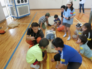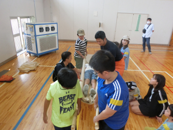 【防災講和】担架を毛布と棒で作って、けが人を運ぶ体験をしました。