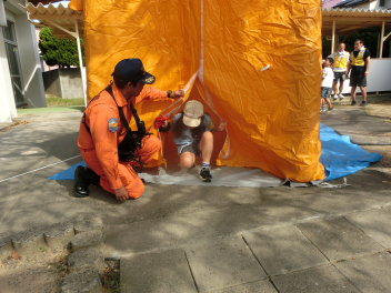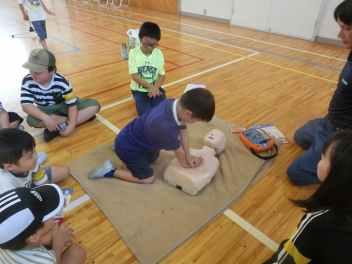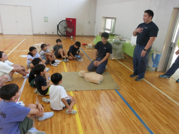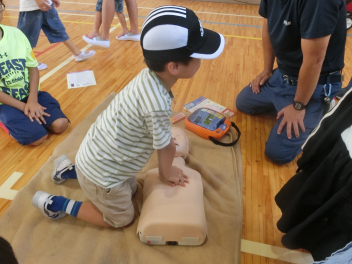 【救急講習体験】消防署の職員から、救急救命の話を聞いてから、心肺蘇生の体験をしました。