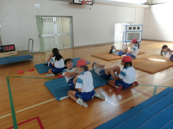 【防災講和】担架を毛布と棒で作って、けが人を運ぶ体験をしました。