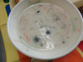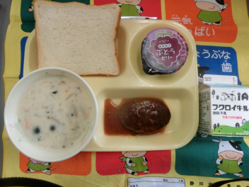 日本 には約 4000 種類 のきのこがあると言 われています。きのこは「森 のお掃除屋 さん」とも言 われていて、自然 の中 で木 や落 ち葉 を分解 する大事 な役割 をしています。きのこにはビタミンDや食物 せんいが多 く、おなかの調子 を整 えたり、皮 ふを丈夫 にしたりするはたらきがあります。今日 のクリームスープにはえのきとぶなしめじが使 われています。えのきはシャキシャキ、ぶなしめじはプリっとした食感 を楽 しむことができます。