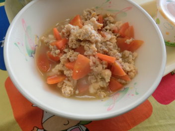 シチューというと、じゃがいもが入 っているのが定番 ですが、今日 はさつまいもで作 りました。さつまいもの旬 は、8 月~11月 ごろです。さつまいもは、収穫後 、2~3か月 ほどおいておくと、水分 がぬけて、甘 くおいしくなります。今日 のシチューは、いつものシチューより甘 い味 に仕上 がっています。じゃがいもよりやわらかいので、食 べた時 の食感 も違 いますね。味 や食感 の違 いを感 じながらいただきましょう。