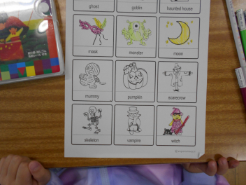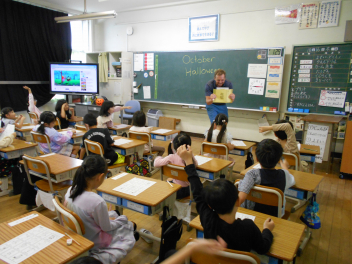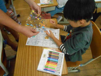 今回は、ハロウィンにまつわる単語を、英語で何というのかを学習した後に、ハロウィンビンゴを行いました。自分が選んだ4つの単語すべてが呼ばれたらビンゴです。ビンゴができると、シールをもらえました。みんな、体を動かしたり、大きな声ではっきりと言ってみたりしながら、楽しく英語を学ぶことができました。