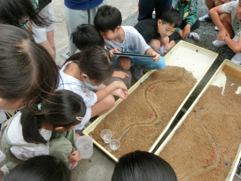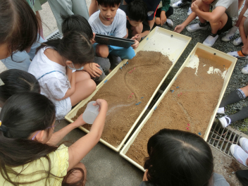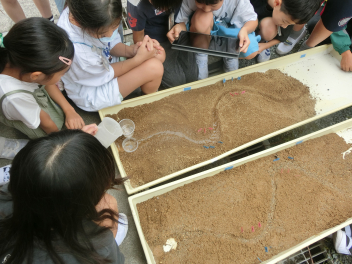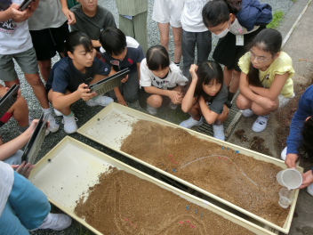 • 10月16日(木)5年生が、理科「流れる水のはたらき」の授業で、流れる水の量を変えて、どのようなはたらきがあるか調べました。