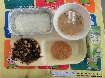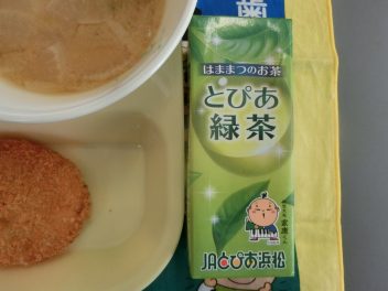 今日 は天竜 川・浜名湖地域合併 20 周年記念献立 です。ごはんは、浜松市内 で作 られている「やら米 か」という特別栽培米 で、農薬 をなるべく使 わずに作 られたおいしいお米 です。また、今日 は、牛乳 の代 わりに浜松市内 で栽培 された茶葉 を使 った緑茶 がつきます。コロッケに使 われているじゃがいもは、三方原台地 で作 られた、ほくほくした三方原 ばれいしょです。地元浜松 でとれた食 べ物 を味 わっていただきました。