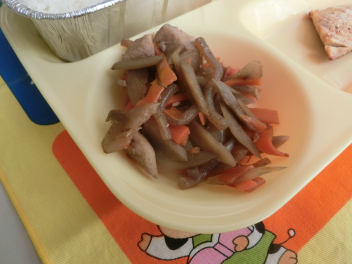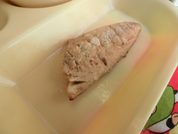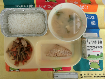 今日 のさばは、塩 こうじに漬 け込 んで焼 いたものです。みなさんは「塩 こうじ」を知 っていますか。お米 のこうじと塩 と水 だけで作 られる発酵調味料 です。塩 こうじに漬 けることでうま味 が増 し、味 も加 わりやわらかくしっとりと仕上 がります。魚 だけではなく、生野菜 や茹 で野菜 などにも使 われます。いつもと違 う風味 を味 わいながらいただきました。