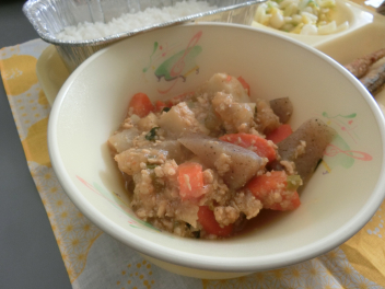 「ごまみそ煮 」は名前 の通 り、ごまがたっぷり入 ったみそ味 の煮物 です。今日 の「ごまみそ煮 」には、だいこん、にんじん、こんにゃく、さといも、葉 ねぎ、しょうがなど、たくさんの野菜 を使 っています。また、うまみを出 すために鶏 のひき肉 をそぼろにして入 れてあります。いろいろな野菜 の味 や鶏肉 のうまみ、ごまの風味 を味 わってみました。