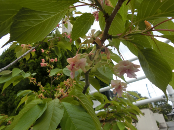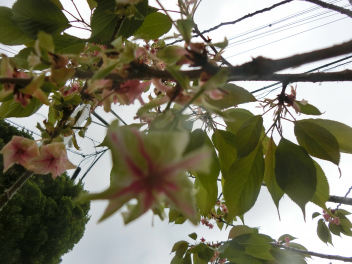 最初に紹介するのは、御衣黄(ぎょいこう)という桜の花です。ピンク色というより緑色の桜の花が咲いています。皇居や新宿御苑などで見られるそうです。とてもめずらしい桜の木の種類だそうです。
