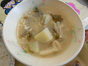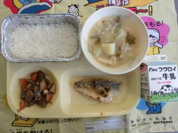 今日 は、「ふるさと給  食 の日 」です。「ふるさと給  食 の日 」は、浜松市内 や静岡県内 でとれる農産物 や海産物 を、給  食 に取 り入 れています。今日 の給  食 は、浜松市産 の「葉 ねぎ」「干 ししいたけ」を使 っています。地域 の産物 の味 を楽 しみましょう。