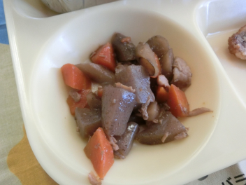 今日 は、行事食 「入  学・進級  祝 い」の献立 です。1年生 のみなさんの入  学 と、2年生以上 のみなさんの進級 をお祝 いして、人気 メニューの「煮 こみハンバーグ」を取 り入 れました。また、デザートは、春 らしく、彩 りがきれいな「さくらゼリー」です。新 しい学級 の友達 と、仲良 くいただきました。