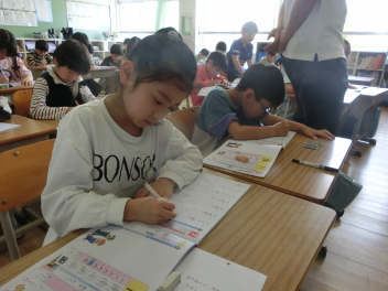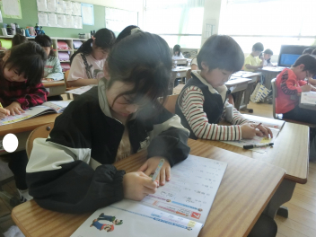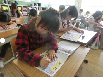 4月20日(月)2年生が、国語の学習で漢字の練習をしていました。2年生になって覚える漢字も増えてきます。先生の話を聞いて、ドリルに丁寧に漢字を書いていました。