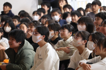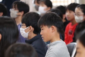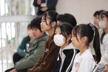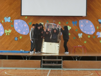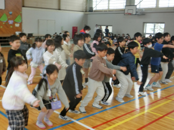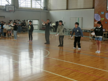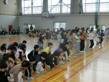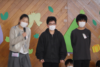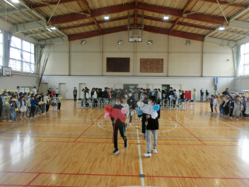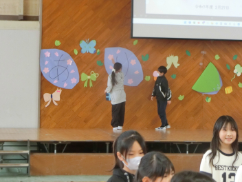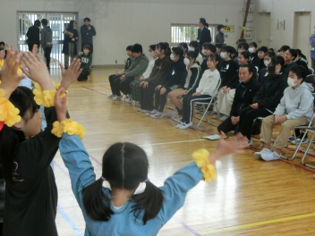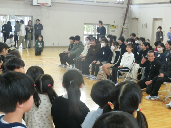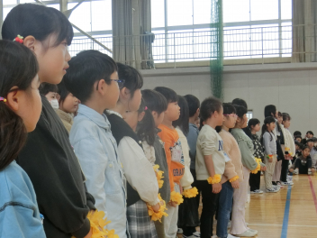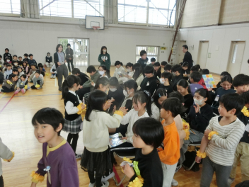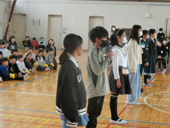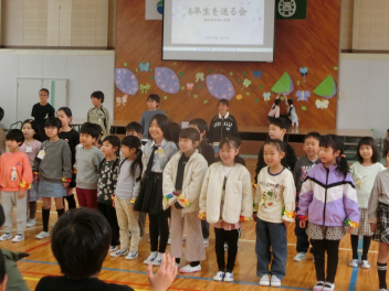 2月27日(金)6年生を送る会が行われました。パート1の続きです。おじいさん「4年生のみなさんと一緒に がの花を咲かせましょう」「せーの」4年生「中学校でも がんばってね」すると 「が」の花が咲きました。1年生が、4月からペアの6年生が、優しくしてくれたお礼を伝えました。6年生が、ペアの1年生を見る目が、とても優しい眼差しでした。