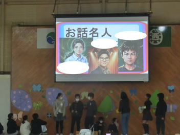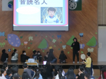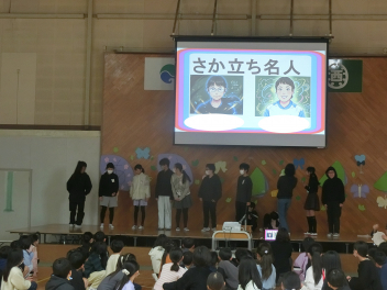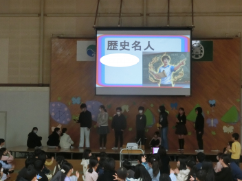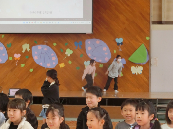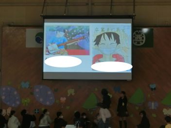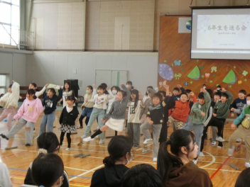6年生を送る会名物:1年生から今までの思いでのスライドとお世話になった先生からのメッセージ動画を見ました。6年生は、とても楽しみにしていたようで、盛り上がっていました。