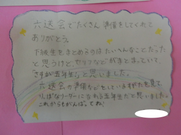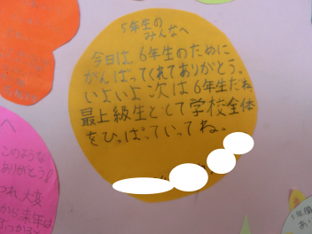 5年生のみなさん 企画・準備・運営してくれて ありがとう。すばらしい「6年生を送る会」を行うことができました。大成功でした。