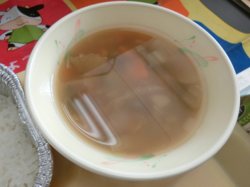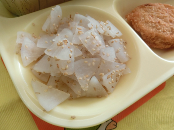 今日 の給食 には、れんこん、ごぼう、にんじん、だいこんなど、土 の中 で育 った根 っこの部分 を食 べる野菜 がたくさん使 われています。その中 でも、れんこんやごぼうには食物繊維 が多 く含 まれていて、お腹 をきれいに掃除 して、病気 の菌 と戦 う細胞 を元気 にしてくれます。今日 は、れんこんの間 にひき肉 をはさんだ「れんこんのはさみ揚 げ」を用意 しました。れんこんのシャキシャキした歯 ごたえを味 わってみました。