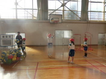バスケットリングやセストボール用のリング(低くて大きいリング)にシュートをして、楽しんでいました。