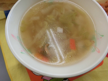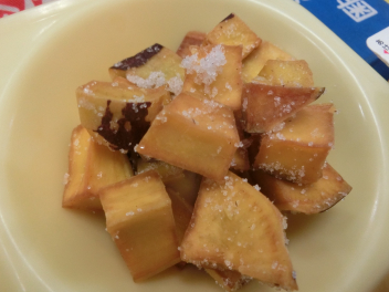 シチューというと、じゃがいもが入 っているのが定番 ですが、今日 はさつまいもで作 りました。さつまいもの旬 は、8 月~11月 ごろです。さつまいもは、収穫後 、2~3か月 ほどおいておくと、水分 がぬけて、甘 くおいしくなります。今日 のシチューは、いつものシチューより甘 い味 に仕上 がっています。じゃがいもよりやわらかいので、食 べた時 の食感 も違 いますね。味 や食感 の違 いを感 じながらいただきましょう。