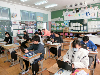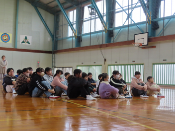 •  情報モラルといじめ防止の視点から全校集会がありました。担当の先生から、「一度投稿されると消えないSNSの怖い部分にも触れ、何か困ったことがあったら一人で抱え込まないで相談するように」と話がありました。