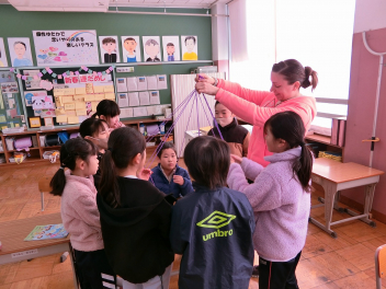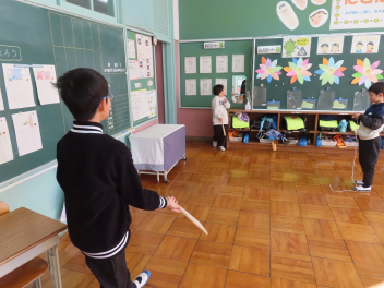 先週、1,2年生が生活科の学習で、昔の遊びの体験をしました。