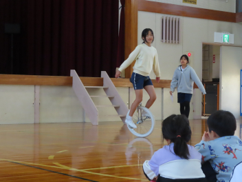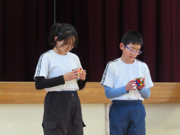 1/16(金)の昼活動で「チャレンジ集会」を行いました。たくさんの参加があり、個人では、こまやけん玉、ルービックキューブ、一輪車など得意技の発表がありました。グループでは、長縄跳びやダンス、フラフープ跳び、お笑いなんていうのもありました。みんなの発表がバラエティーに富んでいて、個性もきらりと光っていて素晴らしかったです。一つ一つの発表に「おおーっ」と声をあげたり、応援したり、笑ったりとたくさんの反応がありました。楽しんでもらいたいと思う人と、楽しみながら盛り上げる人とがいて、とてもいい集会になりましたね。出演した人は、勇気を出して頑張りました。最後の校長先生のピアノ演奏にも感動しましたね。情報委員会のみなさん、運営もありがとうございました。