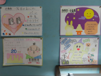 給食室前に掲示してある10月のメニューの紹介を子供たちが楽しそうに見ていました。