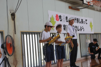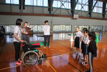 3年生は、総合の時間に「福祉」について学習をしています。浜松市社会福祉協議会北地区センターの「車いす体験」出前講座をしました。体育館にコースを作り、車いすでジグザグ走行や、ロイター板やマットなどで作った段差体験、ユニバーサルトイレの体験をしました。「補助をする人は、車いすを押す以外に、周囲を確認しないといけないところが大変」などの感想をもちました。
