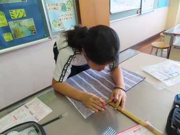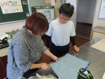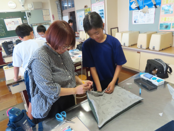 •  家庭科の学習では、手芸ボランティアさんがランチョンマットの角をきれいに裏返す方法や、裁縫道具のリッパ―を使って角を出す方法を教えてくださいました。