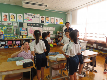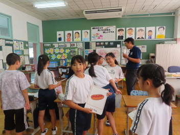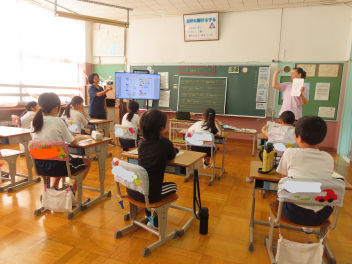 3・4年生は、アシュリー先生の外国語活動で、好きなものを聞いたり答えたりする学習を行いました。