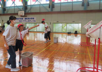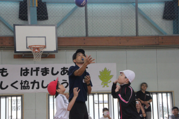 ルールは、児童が保護者と2人3脚をし、玉入れをする。それをリレーする。