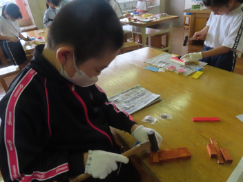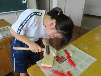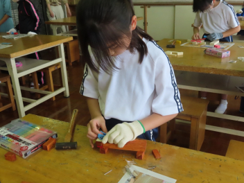 3,4年生が図画工作科の学習で、木材にくぎを打って、動物などの作品を作っていました。
