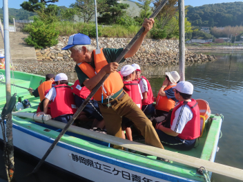• 9月30日(火)に、4・5・6年生による和船で「細江湖一周」があります。その直前練習のため6年生も久しぶりに和船活動に参加をしました。今日の水位は大変低かったため、和船ボランティアの皆さんが必死に離岸をするサポートをして下さいました。おかげで直前練習に出発することができました。また、角立て漁についても地元の漁師さんから湖面で話を聞かせていただくことができました。様々な地域の皆さんのおかげで和船活動ができていることに感謝しています。いつもありがとうございます。本番に向けて、子供たちも目標を立ててがんばる決意をしました。