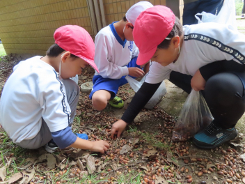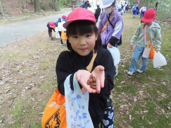 池の周りを歩いていくと、地面いっぱいにどんぐりが落ちている所を発見!子供たちは大喜びでした。