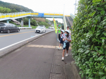地域の皆様が、学校の前に立って旗を持ち、交通安全を呼び掛けてくださっていました。