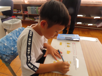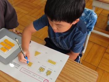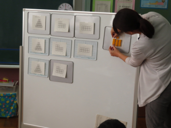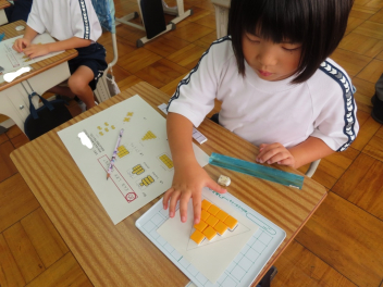 置かれているブロックがいくつあるのか、ブロックを囲みながら式を作り答えを求めました。