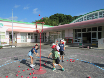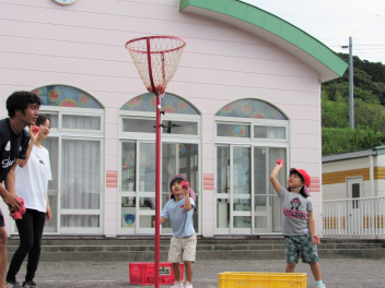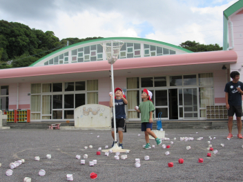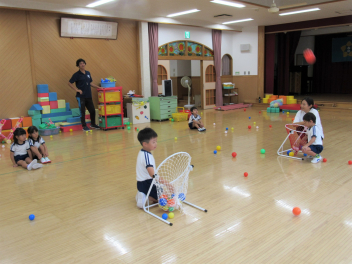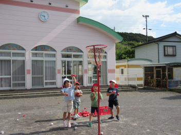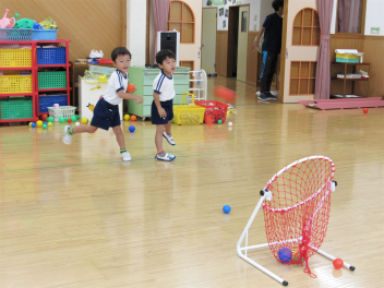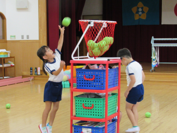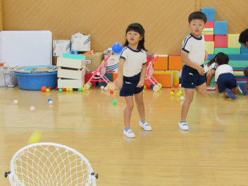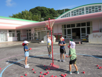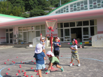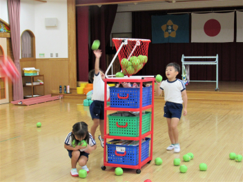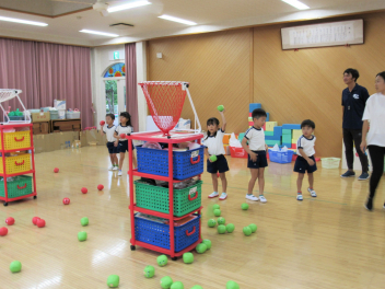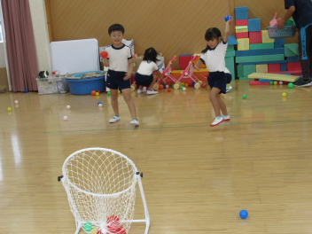 玉入れと言っても、いろいろな遊び方があります。玉入れの玉、軽いカラフルボール、手裏剣などを使ったり、網の高さを変えてみたりと、何回も玉入れゲームをしました。