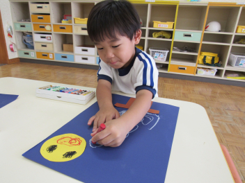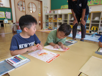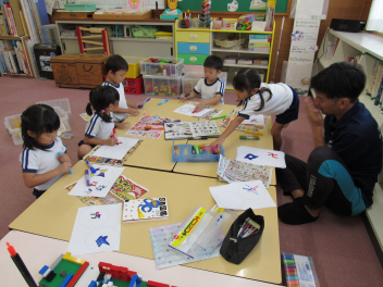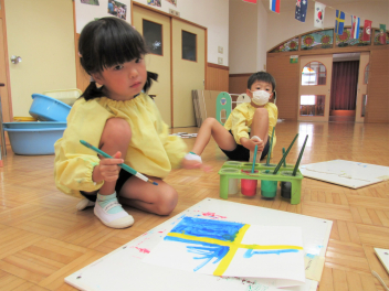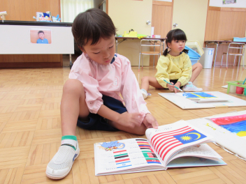 年中さん年長さんは、絵本や室内に飾られている国旗を見ながら、万国旗の絵を描きました。