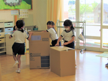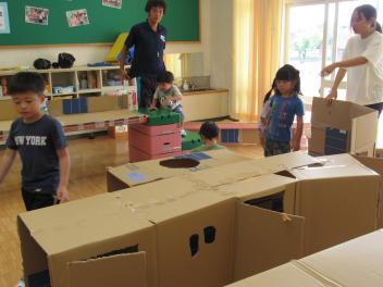 今日は乗り物遊びで盛り上がりました。運転する人、乗せてもらう人、後ろから押す人を声を掛け合って、交代しながら遊びました。